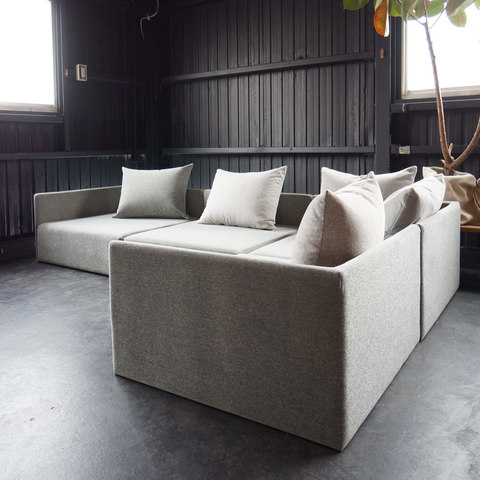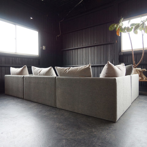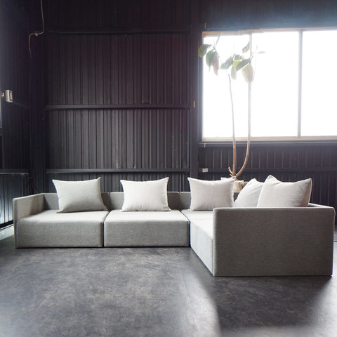 広くゆったりとした座面のローソファになります。座るだけではなく、寝転んでくつろぐには抜群のソファです。低めのローソファはお子様のいるご家庭にも使いやすくおすすめです。肌触りの良いファブリックで使う季節を選びません。お部屋のレイアウトに合わせ、お好きな組み合わせ・配置で使うことが可能です。5つのクッションは同じグレイですが、4種類の違うファブリックを使用して製作しています。