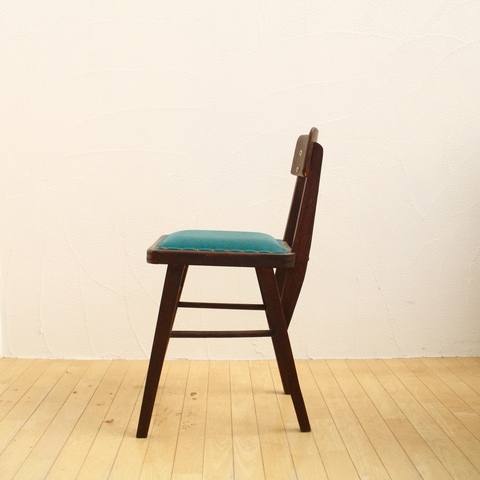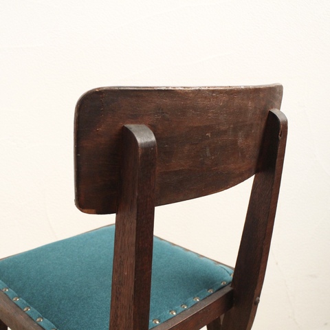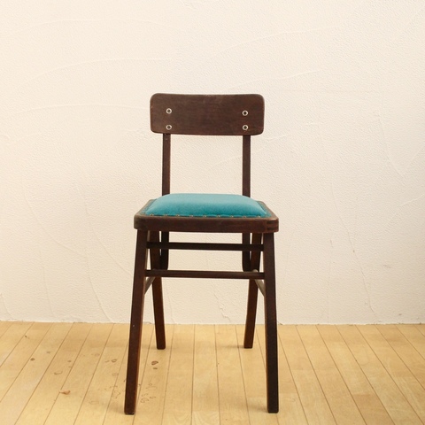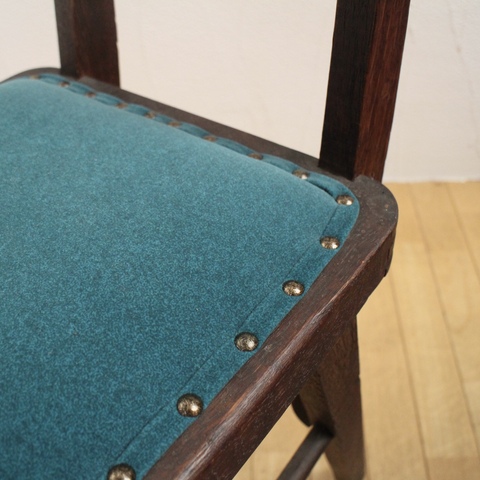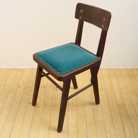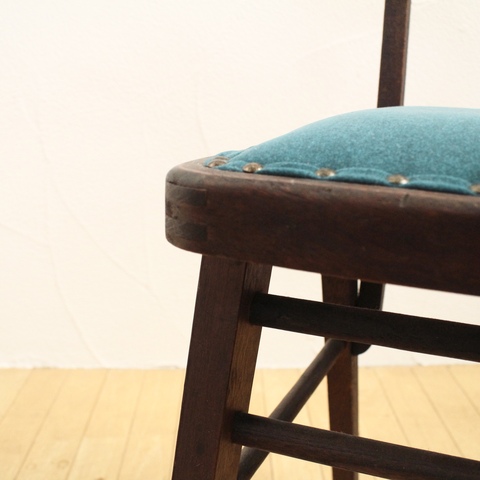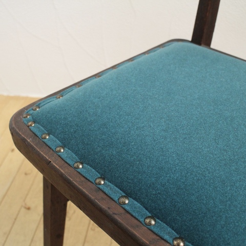 水色の生地と鋲のデザインの椅子がおしゃれな椅子になっています。