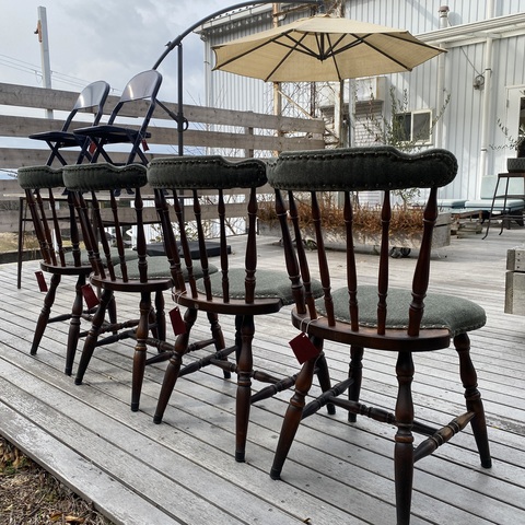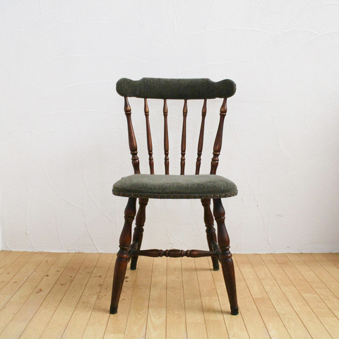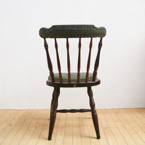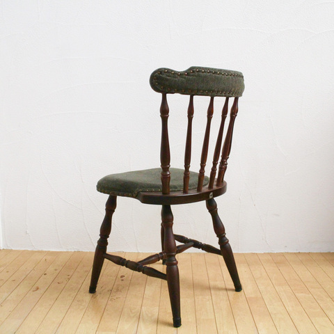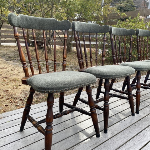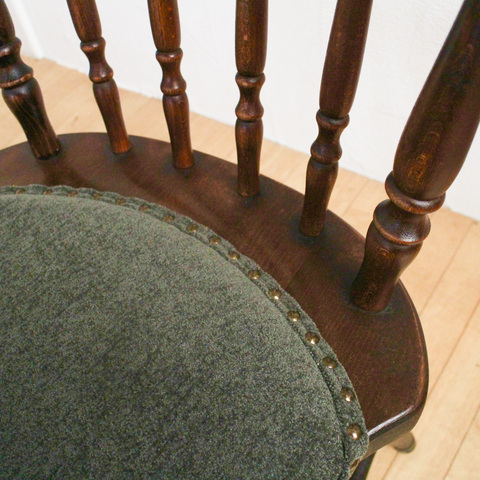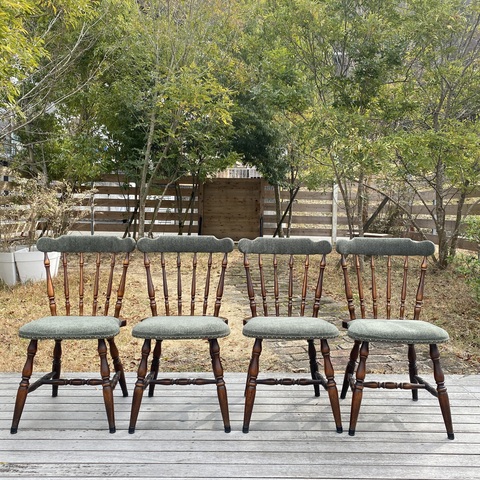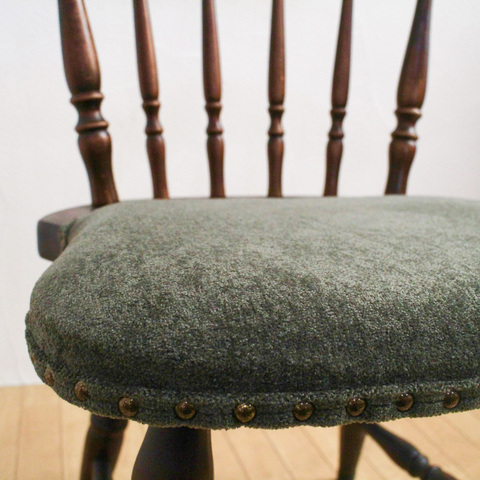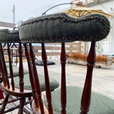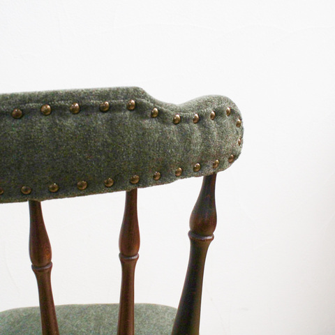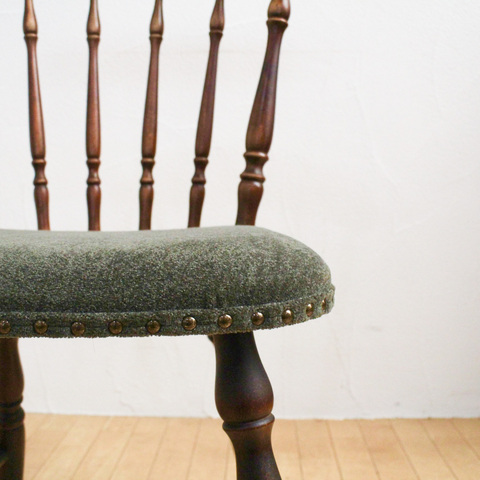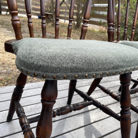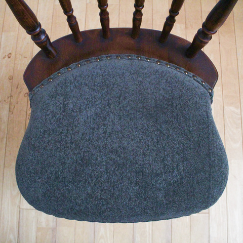 元々木だけのダイニングチェアに座面部分と背もたれに生地と鋲で新しいデザインに変え、リメイクしています。