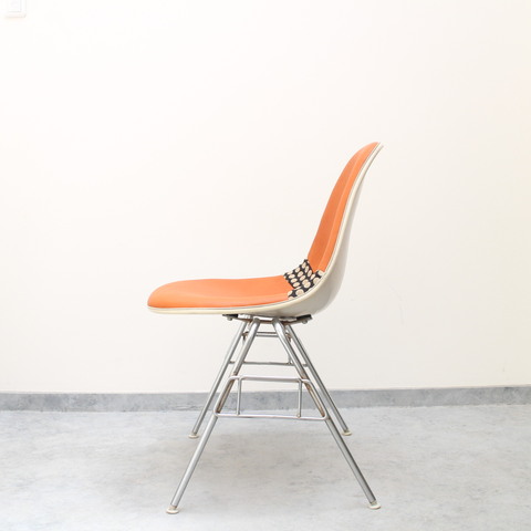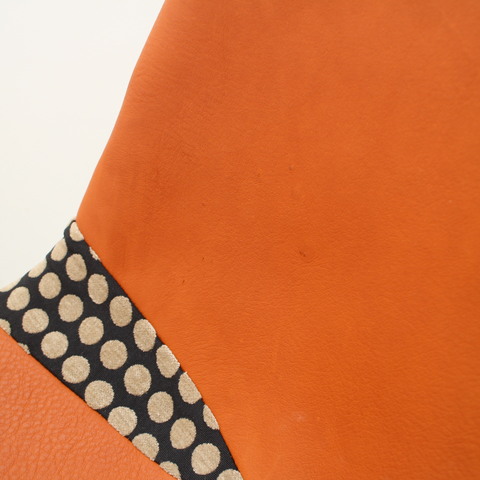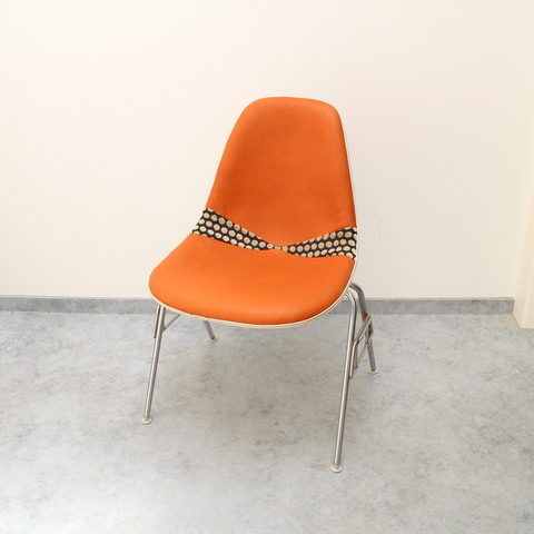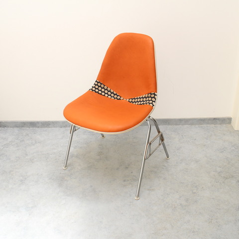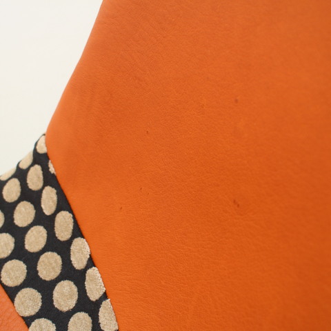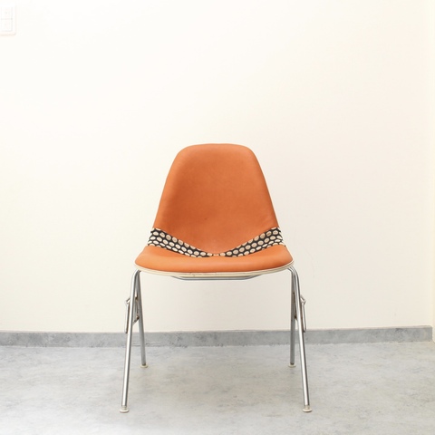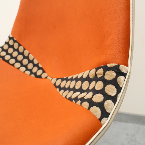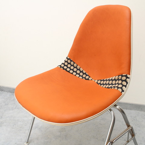 プラスチックサイドシェルチェアに表面のみ本革を張ってリメイクしました。ドット柄のファブリックがアクセントになり、他にはないインパクトのあるチェアに仕上がりました。
