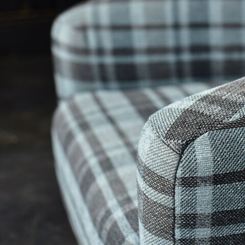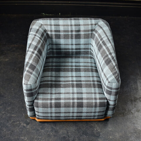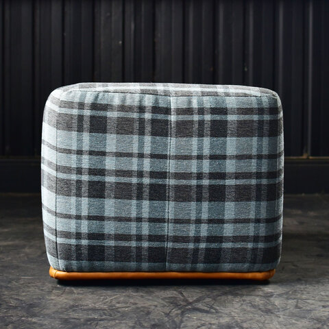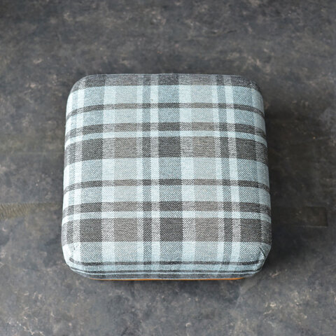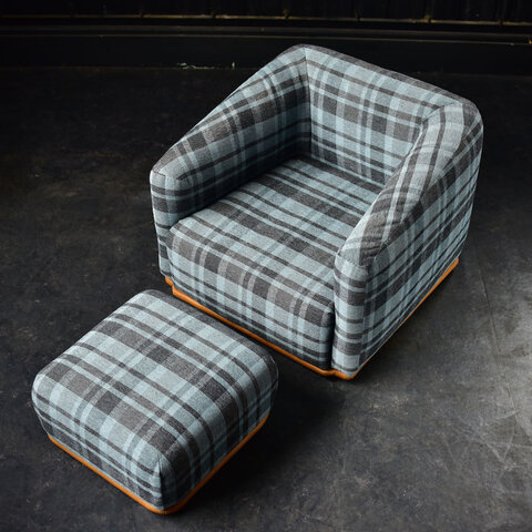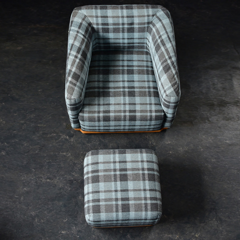 水色チェック柄の子ども用のソファとオットマンのセットになります。(小さなクッション付き)